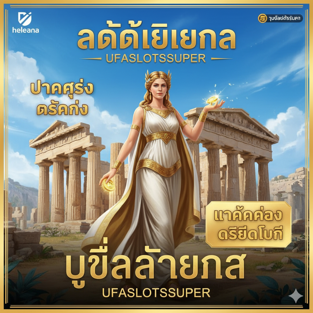 一张引人注目の封面图,主题为古希腊神话风格,突出“Helena Slot”和“Ufaslotsuper”。画面中央是一位美丽的希腊女神“Helena”形象,穿着金色和白色的长袍,背景是宏伟的古代神殿废墟和蔚蓝的天空。女神手持一枚发光的金色硬币或宝石。色彩以金色、蓝色和白色为主,营造出高贵、神秘和财富感。构图采用三分法,将Helena置于焦点位置,并加入“แตกง่าย”และ“เครดิตฟรี”等泰语高亮文字作为装饰元素。