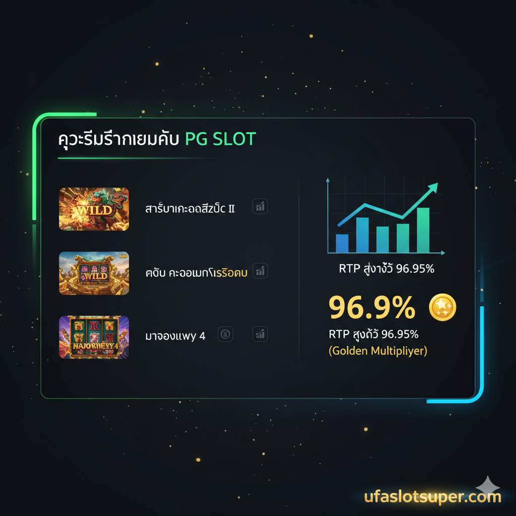 一张展示PG Slot新游戏列表และ核心功能的图片。风格应为数据分析และเกม融合,使用深色背景และ亮绿色/蓝色/金色高亮。图片左侧可以是一个动态的PG Slot新游戏画面截图(如'Treasures of Aztec II'中的Wild符号爆炸效果),右侧是抽象的数据图表元素(如增长的柱状图、RTP百分比符号)และ文字“RTP สูงถึง 96.95%”หรือ“ตัวคูณสีทอง (Golden Multiplier)”等泰文功能描述。整体传达出“数据支持、功能强大”的专业感,对应文章中的表格และฟีเจอร์เด่น。